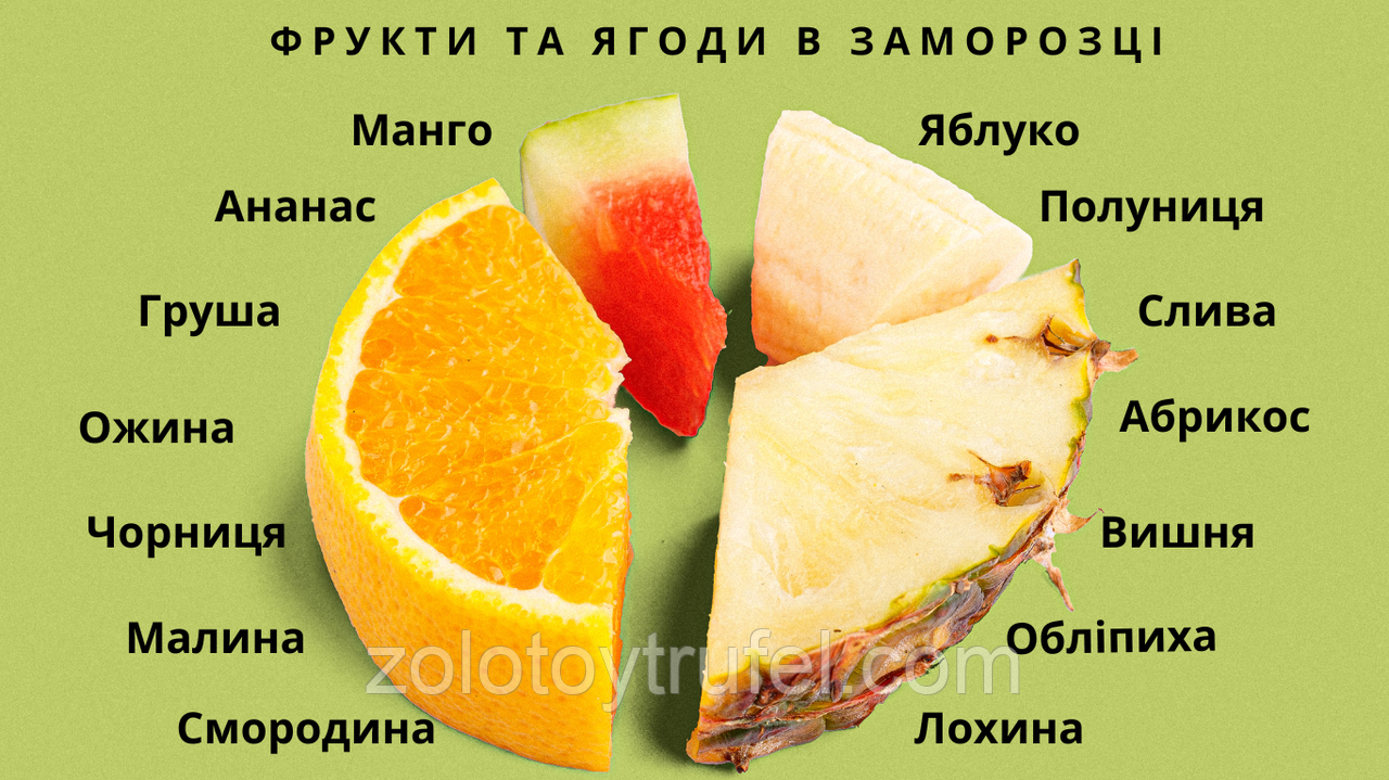 Наразі ми отримали 18 видів вітчизняних та імпортних ягід і фруктів у замороженому вигляді (шокове заморожування) :